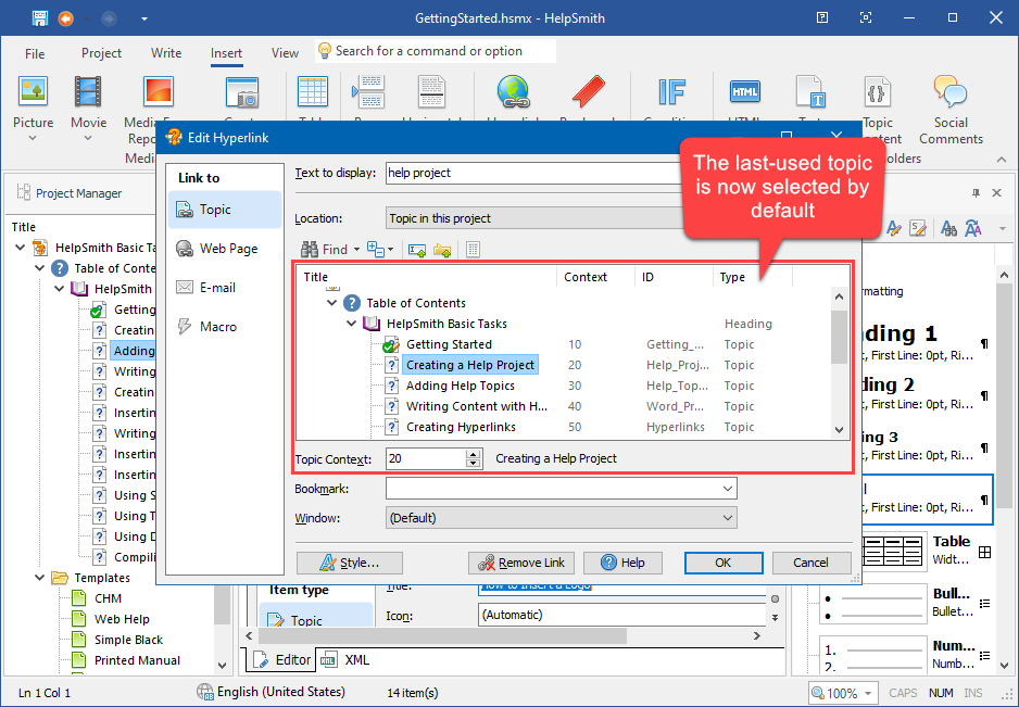 - The Hyperlink dialog now displays the last used topic to help you select topics more quickly.